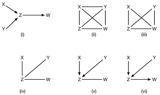 In practice, existing causal discovery algorithms, such as PC [1] or IC [2] or their many extensions and variants, combine both directional and non-directional encoding of causal models. Specifically, a common assumption, such as in PC, is that given an unknown true causal model (shown in Figure 3 by panel (i)), the initial causal model (shown as (ii) in Figure 3) is an undirected graph connecting all variables to each other, which satisfies no conditional independences, and is progressively refined (panels (ii)–(vi) in Figure 3) based on conditional independence data and using edge orientation and propagation rules, such as the Meek rules [12]. For example, the initial stage is to simply check all marginal independences, and given that , that eliminates the undirected edge between X and Y. However, each undirected edge between two vertices, say A and B, that needs to be eliminated due to conditional independence must be checked for increasingly large subsets , and while methods like FCI and later enhancements [6,7] incorporate rather sophisticated methods to prune the space, this process remains computationally expensive, and its practicality remains in question, as in the real world, interventions on arbitrary separating sets [6] may be infeasible. While remarkable progress has been made over the past few decades (see [7] for a state of the art method), it still can be prohibitive and does not always end up with the right model. Edges that remain undirected are interpreted to indicate latent confounders.