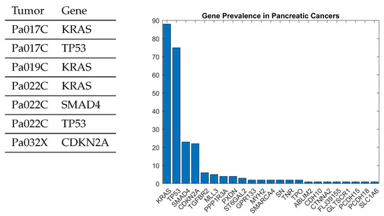 A small fragment of a dataset for analyzing pancreatic cancer [33]. Each tumor is characterized by a set of mutations of genes. The histogram plots the prevalence of each gene over all tumors in the dataset, showing that mutations in the genes KRAS and TP53 are highly indicative of pancreatic cancer.