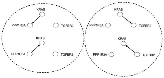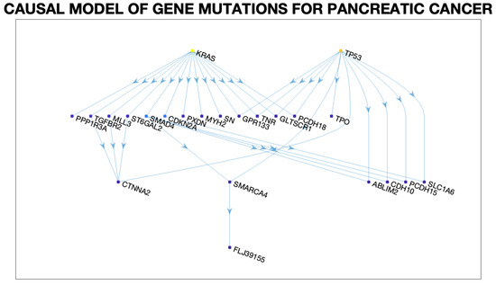 Figure 4 shows a small fragment of a dataset for pancreatic cancer of around 19,000 genes that are subject to mutation in around 40 tumors [33]. In any given tumor, only a relatively small number of genes are mutated. Figure 5 shows a causal DAG model learned from this dataset using a causal discovery algorithm described in greater detail in my previous work [35] based on ideas developed in [6,34]. Specifically, a causal model for pancreatic cancer can be viewed as an example of a cPROP category [16]. The pancreatic cancer causal DAG shown in Figure 5 can be straightforwardly mapped into a cPROP model using the illustrations given previously for simpler DAG models.