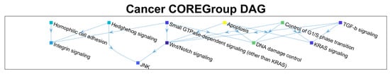 Causal DAG model of the possible 12 pathways and processes whose component genes are most likely mutated in most pancreatic cancers [33]. The specific method used to construct this causal model are described in detail in the previous work on causal homotopy [35], and related methods are described in other previous work [6,34].