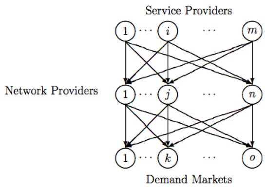 The model assumes m service providers, n network providers, and o demand markets. Each firm’s utility function is defined in terms of the non-negative service quantity (Q), quality (q), and price () delivered from service provider i by network provider j to consumer k. The production costs, demand functions, delivery costs, and delivery opportunity costs are designated by f, , c, and , respectively. Service provider i attempts to maximize its utility function by adjusting (Equation (9a)). Likewise, network provider j attempts to maximize its utility function by adjusting and (Equation (9b)).