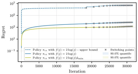 Proposition 3 shows that the regret at iteration j depends on the maximum suboptimality gap of a superarm over all rounds r executed up until the current iteration j as a measure of the worst case regret, and depends on the minimum suboptimality gaps as a measure of the difficulty of the exploration problem. The regret further increases logarithmically in the number of iterations j, which is a desirable property and reflects a successful exploration strategy that does not continuously commit to suboptimal arms in the long run. The regret bound in Theorem 2 is loose due to the use of and in Equation (6). Nevertheless, the bound reflects the same qualitative round-based behavior of the proposed CMAB policies (cf., Section 6). Choosing other parameters to tighten the bound leads to a cumbersome equation.