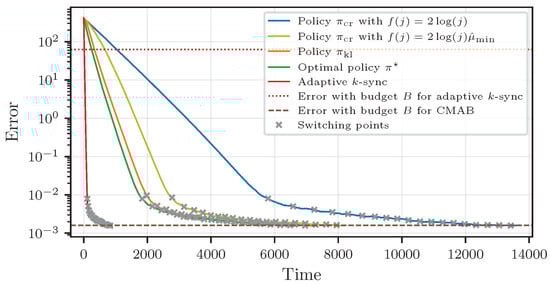 Similar to [8], we consider workers with exponentially distributed response times whose means are chosen uniformly at random from such that . We limit the budget to parallel computations. We create samples with entries, each drawn uniformly at random from with labels , for some drawn uniformly at random from . The model is initialized uniformly at random as and optimized subject to the least squares loss function with learning rate . We assess the performance of the model by the error function , where denotes the pseudo-inverse of , which quantifies the gap to the analytical solution, so that the analysis is largely data-independent and problem-independent. For all the simulations, we present the results averaged over at least ten rounds.