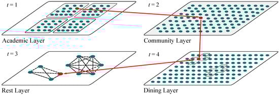 This study employs a multilayer temporal network framework to model the physical contact dynamics among students on the Minhang campus of East China Normal University. The nodes in the networks represent students in this agent-based modeling approach, while the edges within each layer represent the contact relationships between individuals in different locations. The model consists of four subnetworks—Rest Layer (R), Dining Layer (D), Community Layer (C), and Academic Layer (A)—with active nodes capable of migrating between layers (locations). Figure 1 illustrates the migration of active individuals between the four layers from time to in this multilayer temporal network model.