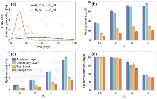 The infection situation in various subnetworks of the campus under different basic reproduction numbers. (a) Daily new infection proportion (%) over time for different basic reproduction numbers (). The blue solid line, cyan dashed line, yellow dotted line, and red dotted–dashed line represent , respectively. (b) Final outbreak size (%) for each layer (Academic, Community, Rest, and Dining) under varying values. Blue, cyan, yellow, and red represent the Academic, Community, Rest, and Dining layers, respectively. Error bars represent 95% confidence intervals. (c) Epidemic peak (%) for each layer at different values. (d) Epidemic duration (days) for each layer across different values.