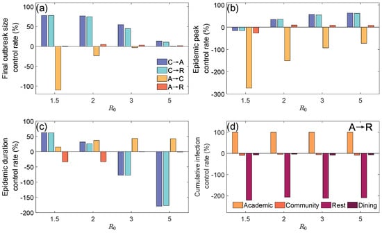 The suppressive effects of four subnetwork closure measures on the epidemic situation under different basic reproduction numbers. (a) Final outbreak size control rate (%) for each intervention measure across varying values. Blue, cyan, yellow, and red represent (Community to Academic), (Community to Rest), (Academic to Community), and (Academic to Rest), respectively. (b) Epidemic peak control rate (%) for each intervention measure at different values. (c) Epidemic duration control rate (%) for each intervention measure across varying values. (d) Cumulative infection control rate (%) for each layer under the intervention measure across different values. Warm orange, bright red, deep purple-red, and deep burgundy represent Academic, Community, Rest, and Dining, respectively.