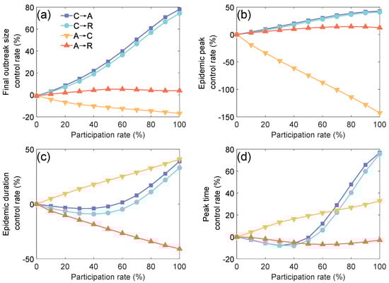 Figure 4a,b show that the final outbreak size control rate and epidemic peak control rate follow a similar trend as the participation rate changes. When the Community Layer is closed, both final outbreak size infection control rate and the epidemic peak control rate increase significantly with the participation rate, suggesting that increasing the participation rate for this strategy can effectively curb epidemic spreading. However, under the strategy of closing the Academic Layer, an increase in the participation rate leads to a slight decrease in the control rate of migration to the Community Layer. This phenomenon occurs because, after the migration from the Academic Layer to the Community Layer, the Community Layer, as a high-contact area, experiences an increase in population density and contact frequency, which in turn exacerbates the risk of virus transmission.