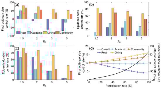 Zoned management is an efficient epidemic prevention strategy at the university, which primarily involves dividing the student population into two roughly equal management areas, with non-overlapping contact zones. By physically isolating different functional areas while ensuring that each management area has complete facilities such as academic buildings and dormitories, this strategy can significantly reduce the contact density in high-mobility areas (e.g., Community and Dining Layers). However, since teaching and rest behaviors are typically confined to fixed regions, their contact patterns are less affected by zoned management. Figure 5 quantifies and evaluates the effectiveness of the zoned management through multiple dimensions. The three subgraphs (a)–(c) show the differentiated regulatory mechanisms of the zoned management on each subnetwork from the perspectives of epidemic peak control rate, the final outbreak size control rate, and epidemic duration control rate. Figure 5d illustrates how the overall final outbreak size control rate and subnetwork final outbreak size control rate vary with the participation rate of the zoned management measures.