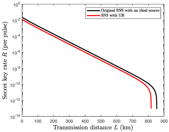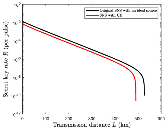Furthermore, we can analyze the performance of this monitoring scheme under untrusted source conditions and actual simulation parameters. The simulation results are shown in Figure 3. To simulate a real-world QKD system, we also consider factors such as a high dark count rate and low detection efficiency. Additionally, factors such as fiber attenuation, inherent system errors, and non-ideal data coordination efficiency are also considered in a non-ideal environment. Finally, the experimental parameters are chosen based on Table 2. The simulation result shows that under untrusted source conditions, the maximum secure transmission of the SNS protocol based on the UB monitoring scheme can reach 490 km, which is over 92% of the ideal light source environment. According to this result, although combining the UB monitoring scheme requires sacrificing some signals outside the UB interval, the performance can still be maintained within an acceptable range under certain experimental conditions.