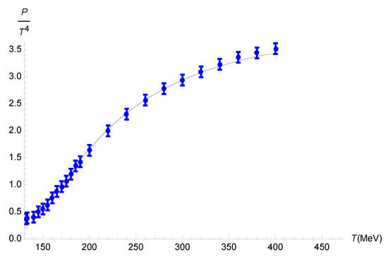 Therefore, the running parameter , driving corrections due to a functional measure encoding quantum gravity effects, can be realized as a temperature-dependent parameter. Data obtained from (2+1)-flavor lattice QCD for the pressure and relaxation time can be compared to the results whose quantum gravity corrections were estimated in Section 3 and Section 4 for temperatures in the range 130 MeV MeV, where an entirely hadronic description is not appropriate. Additionally, this temperature range is not sufficiently high to ensure a straightforward formulation through perturbative aspects of QCD.