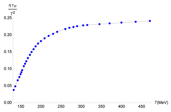 where is a sufficiently large temperature, which implies proximity to the ultraviolet fixed point. The temperature-dependent part, which is independent of the ultraviolet cutoff of , approaches , , and is a constant to be subtracted to ensure that , where is the lowest temperature considered in the numerical calculations ( MeV) [63]. Analogously, to evaluate the relaxation time for the shear relaxation in Equation (43), one can define