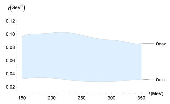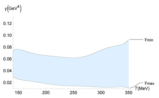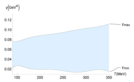 Range of the running parameter () as a function of the temperature (MeV), using the numerical data corresponding to Figure 1.