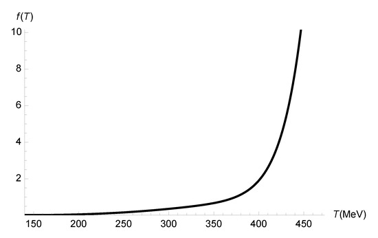 with MeV. The first term in Equation (88) implements a resonance-like peak, whereas the second term is responsible for a smooth background apart from the peak. We can substitute the temperature-dependent bulk viscosity (88) on the very right-hand side of Equation (86), keeping in mind the expression for the entropy density . The plot of the quantum-correcting function, , is shown in Figure 10.