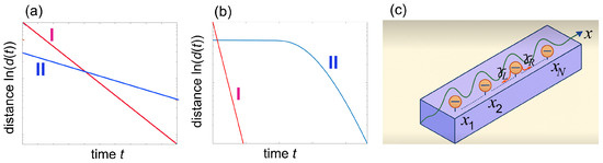 However, when is not a normal operator, i.e., , the inverse of the spectral gap does not set an upper limit to the characteristic relaxation time toward equilibrium, which can be much longer than . Indeed, several studies have emphasized that the actual relaxation time is not necessarily bounded by the Liouvillian gap [53,54,55,56], although the latter does determine the asymptotic decay rate in the long-time limit [15]. This implies that, in the transient regime, the system can exhibit decay rates that are slower than the Liouvillian gap would suggest. Such anomalously slow relaxation, which arises from the interference terms on the right hand side of Equation (5), can give rise to Mpemba-like effects without requiring accelerated thermalization for one of the two initial states. This type of ME, schematically illustrated in Figure 1b, is fundamentally different from the strong ME and may be referred to as the non-normal Mpemba effect, as it originates from the non-normal nature of the Liouvillian superoperator.
