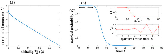 (a) Behavior of non-normality of the effective non-Hermitian matrix (Henrici parameter ) versus the ratio (chirality) in the waveguide QED setup of Figure 1c comprising equally spaced point-like quantum emitters. Parameter values are , and . (b) Numerically computed behavior of the survival probability versus time t for the initial state with amplitudes depicted in the lower inset of panel (b). Parameter values are , , , , and . Note that the survival probability displays anomalous relaxation dynamics, with a nearly suppressed decay for a resilience time interval , followed by a rapid drop toward zero. The upper inset in (b) shows the numerically computed behavior of versus t, where is the largest eigenvalue of and .