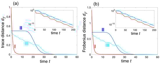 where . To quantify the distance of the system from its equilibrium state during the relaxation process, different measures can be assumed (see e.g., [13,63]), such as the trace distance and the Frobenius (Hilbert-Schmidt) distance , where . For example, assuming the Frobenius distance , using Equation (4), one has the following: