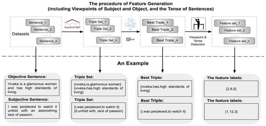 In summary, detecting objectivity in informal short texts remains a challenging task due to their informal nature [63,64] and lexical sparsity. Traditional feature engineering methods [65] have proven inadequate, and while deep learning and pre-trained models have improved performance, they still encounter significant limitations. The ongoing research continues to explore hybrid methods that combine advanced neural networks with syntactic and semantic extraction techniques to better capture the nuances of informal language and improve objectivity detection in short texts [66]. One of the possible solutions aiming at objectivity detection in short informal texts is to investigate the latent information implied in relational triples by combining the nature of objectivity in text. This study is supposed to investigate the effectiveness of the latent features of the relational triples—viewpoints of subjects, tense of predicates, and viewpoints of objects in the task. The details of our methodology design are demonstrated in the following two sections.