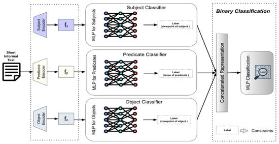 Traditional relational triple-relevant tasks primarily aim to structure information from texts for further analysis and knowledge representation to assist the tasks of information extraction [32], knowledge graph construction [33,34], semantic understanding [35], etc. That means the concept of relational triples maintains a foundational possibility that could support a nuanced approach to understanding content in brief and fragmented statements, especially for informal short texts. Specifically, relational triples help deconstruct these fragmented statements into their core components, which allow for a more nuanced understanding of the underlying objectivity in the statement [36]. Moreover, the latent features of relational triples, such as viewpoints and tenses, are especially valuable as they reveal the essential elements needed to determine whether a statement is objective or subjective [37]. For example, first-person pronouns (e.g., “I believe”, “We think”) typically signal subjective opinions, while impersonal subjects (e.g., “Research shows”, “Statistics indicate”) suggest an objective stance. Furthermore, tense is not merely a grammatical marker; in pragmatics, it functions as a tool to frame information in terms of relevance and reliability. Therefore, effective feature representation for relational triples holds significant potential for identifying objectivity from informal short texts.