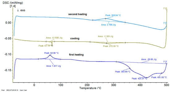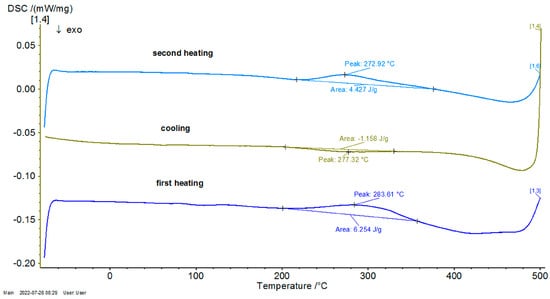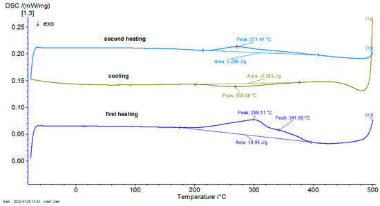 The DSC measurements were carried out using a Netzsch STA 449 F1 Jupiter calorimeter (Netzsch-Gerätebau GmbH, Selb, Germany), with a high resolution and fast response. In selected cases, where higher sensitivity was required, a Netzsch DSC 404 F3 Pegasus (Netzsch-Gerätebau GmbH, Selb, Germany) was employed, capable of detecting thermal signals down to 0.1 µW. The samples were tested in both heating and cooling cycles, within the range of −50 °C to 500 °C, under a protective nitrogen atmosphere. The heating/cooling rate was set at 10 °C/min [7].