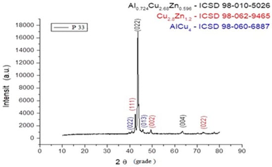 From the presented XRD diffractograms, made on samples tempered in water, the maximums, which identify the β phase corresponding to the chemical composition situated between 15% and 25% Zn of the alloys selected for study, are highlighted. Furthermore, a large part of the diffraction intensities can be identified as belonging to the crystallized martensitic network in the cubic system. In addition, to improve phase identification, indexed peaks corresponding to both β-phase (austenitic) and martensitic structures have been annotated in Table 2. These indexations enable direct comparison with standard Cu-Zn-Al phase transformation references.