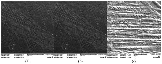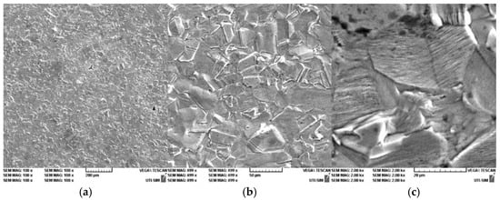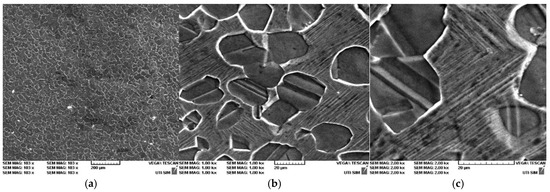 In Figure 14, Figure 15 and Figure 16, it is possible to observe the images of the surfaces of the samples, obtained through SEM. The surface areas of the samples were mechanically processed and attacked with surfactants in order to highlight the microstructure of the experimental alloys. The microstructural analysis of the Cu-Zn-Al alloy was carried out with the samples being in a laminated state, followed by a thermal hardening treatment (Figure 14a–c, Figure 15a–c and Figure 16a–c). The surfactant used was a standard metallographic etchant composed of 5 mL nitric acid (HNO3), 5 mL acetic acid (CH3COOH), and 90 mL distilled water, applied for 15 s at room temperature. This solution was effective in revealing martensitic plates and phase boundaries.
