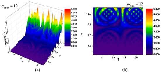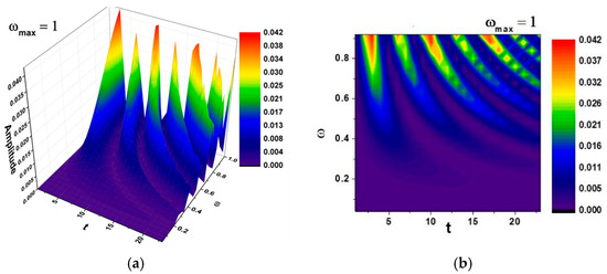 (a,b)—Three-dimensional and contour plot of the solution for the maximum value of the pulsation-type characteristic where and . Correspondence with Figure 14b is shown.