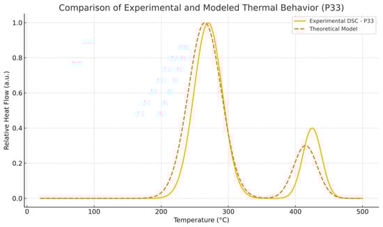 Overlay of modeled thermal profile and experimental DSC thermogram for sample P33, showing agreement in peak locations and profile shapes.