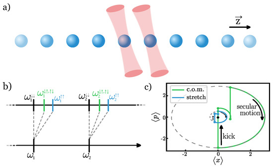 An example sequence can be observed in Figure 1c, which represents a two-ion phase gate for on a two-ion crystal, with the tweezers pinning the two ions in the array. The kicks represent pure displacements in momentum space, and the free evolution periods are secular motion in space with a constant phase. The initial phase space orbit for each of the normal modes is restored by the end of the pulse sequence, demonstrating that the commensurability conditions are satisfied.