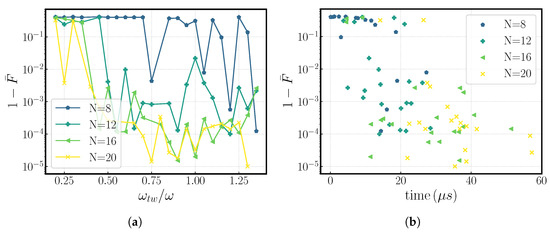 After sweeping over different values for the kick number, N, and tweezer frequency, , we obtain the results shown in Figure 2 for a gate performed in a two-ion crystal. The infidelities obtained are as good as , so long as we have an adequate number of kicks (generally ), and the employed tweezer frequency is ; see Figure 2a.