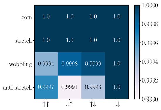 The overlap between the initial and final motional states for a gate performed in a four-ion crystal, with tweezers pinning the two left-most ions, using a tweezer frequency and kicks. The gate takes s and has an average gate fidelity of . For each mode and spin combination pair, we plot the coherent state overlap between the initial (before gate) and final (after gate) state configurations, .