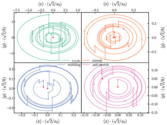 The phase space trajectories of the spin-state for the four motional modes in a 4-ion crystal, performing the gate on the 2 left-most ions. These trajectories correspond to the same gate used in Figure 3, with a tweezer frequency and kicks. It can be observed in the lower-right and -left panels how the wobbling and anti-stretch modes do not exactly close at the end of the trajectory.