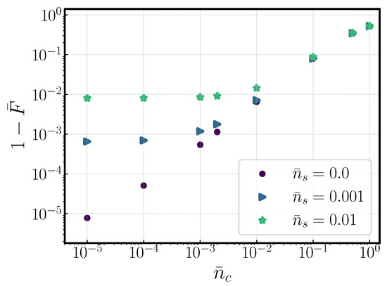 In this article, we have stayed within the confines of protocol 1, which requires ground state cooling and for Equation (10a) to be satisfied. In this way, it is relevant to investigate how the gate performs if this cooling is not perfect and there is some mode occupation beyond the ground state. These results are portrayed in Figure 5, where an originally solution is exposed to increasing com. mode occupation, , for three different values of occupation of the stretch mode, . We observe how the infidelity decays to as the com number occupation rises to the same value, following the same exponential trend. The number occupation of the stretch mode equally limits the minimum achievable infidelity.