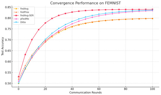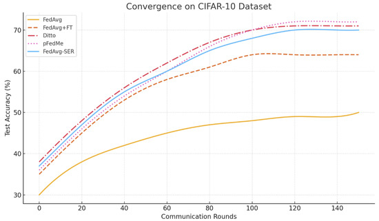 Figure 3. Convergence curves on the CIFAR-10 dataset for FedAvg, FedAvg+FT, FedAvg-SER, Ditto, and pFedMe. FedAvg-SER and Ditto show faster and more stable convergence than FedAvg, with pFedMe ultimately achieving the highest accuracy. All methods were averaged over three runs, with standard deviations omitted for clarity.