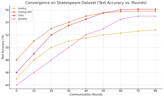 Figure 2. Convergence curves on the Shakespeare dataset for FedAvg, FedAvg-SER, Ditto, and pFedMe. FedAvg-SER and Ditto converge faster and more stably than FedAvg, with Ditto achieving the highest final accuracy. pFedMe converges more slowly, but reaches comparable final performance.