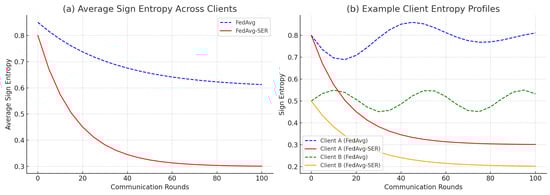 Figure 4. Gradient sign entropy dynamics: (a) mean entropy across all clients over training rounds and (b) individual entropy trajectories for two clients with distinct data distributions. SER consistently reduces entropy, indicating smoother optimization paths.