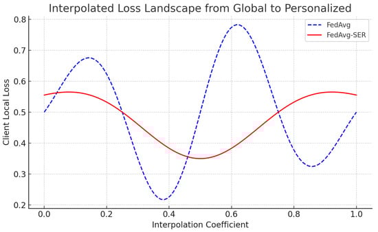 Figure 5. Interpolated loss curves between global and personalized models for a sample client. The SER-regularized loss exhibits a smoother unimodal shape, supporting the hypothesis that SER encourages flatter regions of the loss landscape.