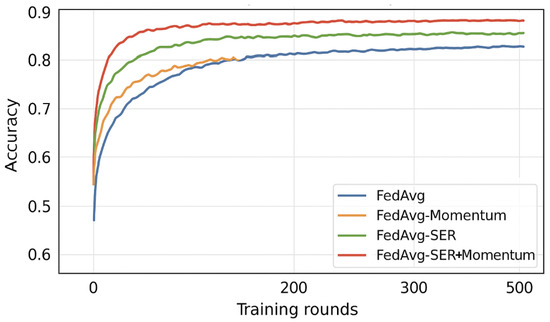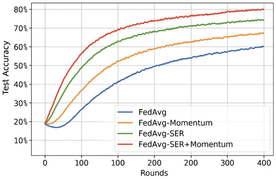 Figure 6. Convergence on CIFAR-10 comparing FedAvg, FedAvg-Momentum, FedAvg-SER, and FedAvg-SER+Momentum.