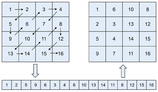 Typically, the Zigzag operation begins at the top-left corner of the matrix and moves diagonally, alternating between upward and downward directions, until all elements are traversed. This traversal pattern transforms the original sequential arrangement of data into a scrambled order, effectively reducing spatial correlation among neighboring elements. Figure 1 illustrates the scanning process in detail for a fourth-order square matrix.