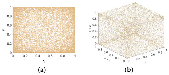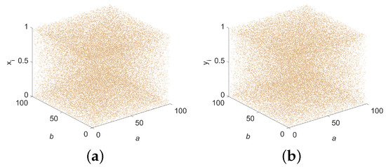 The phase space trajectory provides an intuitive method for observing system dynamics. When the points representing the chaotic sequence densely populate the coordinate space, it implies that the nonlinear system’s output exhibits enhanced randomness. Figure 3a presents 2D phase space trajectory diagrams of versus , while Figure 3b illustrates the 3D phase space trajectory formed by v + 2, v + 1, and v, where v denotes the combined x and y series.