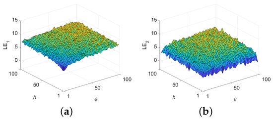 A 2D chaotic system typically has two LEs, denoted as and . In this section, the 3D plots of and for 2D-ELSCM, varying with respect to parameters a and b in the range of [1, 100], are presented in Figure 4. As observed, with changes in the control parameters a and b, both and remain positive. This confirms that the 2D-ELSCM exhibits hyperchaotic behavior over a broad range.