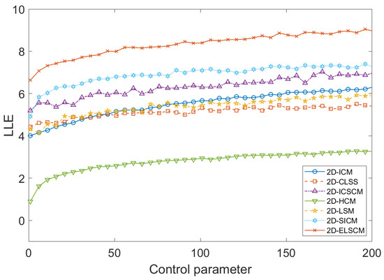 The largest Lyapunov exponent (LLE) is a critical metric for quantifying the chaotic behavior of a dynamic system. A higher LLE value indicates a greater degree of chaos, reflecting stronger sensitivity to initial conditions, as well as increased uncertainty and unpredictability [27]. Figure 5 presents a comparison of the LLE values across different 2D chaotic systems. Additionally, the average LLE values for 2D-ELSCM and other chaotic systems are summarized in Table 4. Notably, the proposed map exhibits larger LLE values, confirming that the 2D-ELSCM demonstrates enhanced dynamic behavior and stronger chaotic properties.