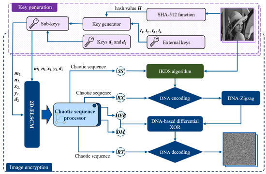 Based on the 2D-ELSCM, this study proposes an innovative chaotic image encryption method to ensure the security of image information. The framework of the proposed cryptographic scheme is depicted in Figure 7.