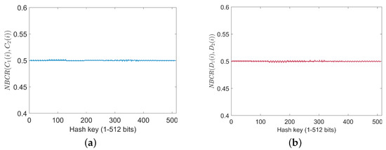 NBCR analysis for encrypted and decrypted images: (a) NBCR of encrypted images with a one-bit key change; (b) NBCR of decrypted images with a one-bit key change.