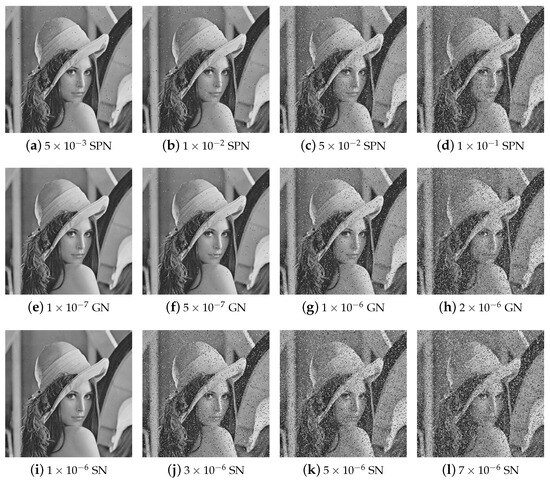 Decryption results of cipher images with different densities of SPN, GN, and SN.