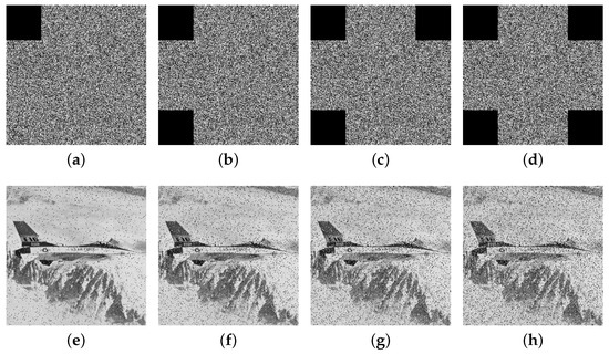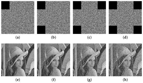 The encryption images with cropping attack (a) 1/16, (b) 1/8, (c) 3/16, (d) 1/4 and (e–h) represent their respective decrypted images.
