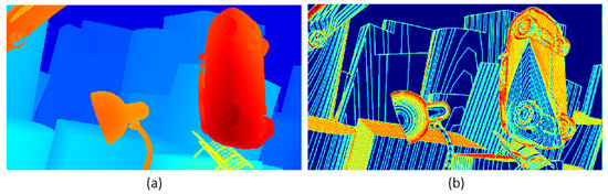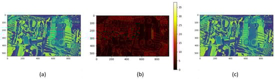It can be seen from Formula (2) that the local entropy value is usually low in the area with uniform disparity; however, in boundary areas (such as depth edges and occluded areas), the local entropy value is higher. In order to optimize these differences more effectively, we use standard deviation, , to weight in order to obtain the weighted local entropy: