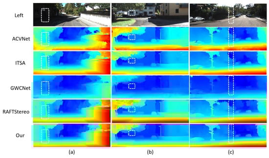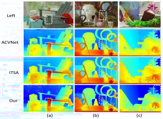 In this ablation experiment, we conducted a detailed evaluation of the impact of the transformer-based cross-image attention mechanism (CIAM-T), Multi-Resolution Cost Volume Fusion (MRCV-F), and local structure entropy (LSE) on the performance of stereo-matching models. The EPE of the reference model GwcNet is 0.8306 pixels, and the D1 error rate is 0.0279%. After the introduction of the CIAM-T module, the EPE is reduced to 0.7366 pixels and the D1 error rate is reduced to 0.0252%, which indicates that the CIAM-T module significantly improves the model’s ability to capture cross-image information. After the MRCV-F module is added, the EPE is further reduced to 0.7866 pixels, and the D1 error rate is 0.0253%, indicating that the module enhances the model’s ability to capture multi-scale information. When only the LSE module is used, the EPE drops to 0.7123 pixels, and the D1 error rate is 0.0243%, which shows that the LSE module plays an important role in error control of complex geometric structure areas (see Table 4).