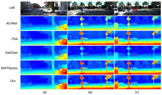 During the experiment, the authors of this paper compared the performance of several stereo-matching models in detail and evaluated their performance on different data sets, including KITTI 2012, KITTI 2015, and Middlebury V3. The quantitative performance results of the different methods on each data set are shown in Table 2. LSE-CVCNet (marked with “Ours”) shows obvious advantages on the KITTI 2012 and KITTI 2015 data sets, with error rates of 4.01 and 3.61, respectively, which is significantly lower than those of other classical methods such as PSMNet, GwcNet, GANet, ITSA, and RAFT-Stereo. At the same time, LSE-CVCNet performed very well on the Middlebury data set, achieving an error rate of 9.94, close to the best-performing Graft-PSMNet (9.7). These results show that LSE-CVCNet not only performs well in standard scenarios but also maintains strong robustness and accuracy in cross-domain data.