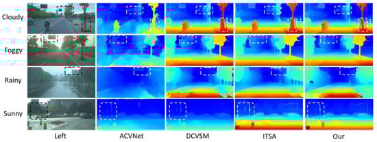 Comparison of parallax map results generated via models under various weather conditions (cloudy, foggy, rainy, and sunny).The chart uses unified heatmap color coding (red/yellow for near—field, green for mid—distance, blue for far—field). It shows the left—view and disparity maps of four models (ACVNet, DCVSM, ITSA, and Our model) side by side for easy comparison. Each row represents a weather condition, with white/black dashed boxes highlighting key analysis areas (like vehicle edge—preservation in fog, noise—reduction in rain). The chart bottom notes to interpret details with the color legend and dashed—box annotations. The design is simple, the comparison intuitive, verifying the proposed method’s advantage in maintaining integrity and accuracy under complex weather.