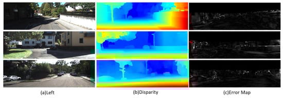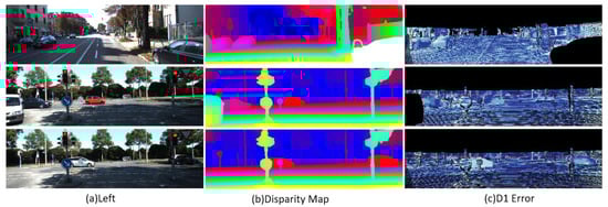 Stereo matching test results on the KITTI 2015 dataset. (a) Original left-view image; (b) Disparity map, where different colors represent different depth information (warm colors indicate nearby objects, and cool colors indicate distant objects); (c) Visualization of error matching regions (D1 Error). The red areas identify the erroneous corresponding points generated by the stereo matching algorithm. These regions indicate that the algorithm has difficulties in depth estimation, typically occurring in areas with poor texture, occlusion boundaries, or lack of features. The results show that there is still room for improvement in the tested algorithm under complex urban street scene environments.